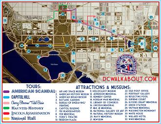 At the bottom of the Tourist Map there is a color-coded key showing the routes of our Washington DC tours, as well as the number-coded locations of all the major memorials, monuments, museums, etc.